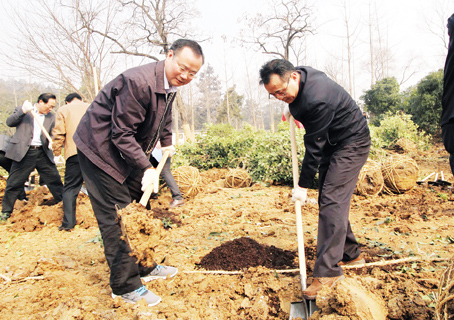 上午10時許,一到植樹現(xiàn)場,周春雨、白金明、何金良、顧世平、方志宏等市幾大班子領導就迅速融入到植樹勞動的大軍之中。他們興致勃勃地拿起鐵鍬,同在場的干部一起揮鍬挖土,將一棵棵樹苗植入樹坑,培土,澆灌,每道工序都做得十分認真。市委書記周春雨、市長白金明一邊植樹,一邊與市林業(yè)局、住建委負責同志交談,了解全市植樹造林及“綠滿珠城”工作開展情況。經過一番緊張勞動,300多棵桂花、櫻花等樹木昂然挺立,在和煦的春光中綻放蓬勃生機。