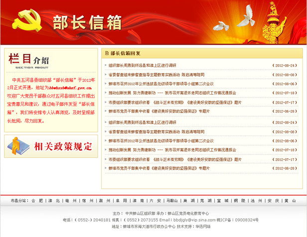 中共五河縣委組織部“部長信箱”于2012年2月正式開通,地址為bbwhzzb@ahxf.gov.cn。歡迎廣大黨員干部群眾對五河縣組織工作提出寶貴意見和建議,通過電子郵件發(fā)至“部長信箱”,我們將安排專人認(rèn)真瀏覽,及時(shí)呈報(bào)部長批閱,盡力回復(fù)。